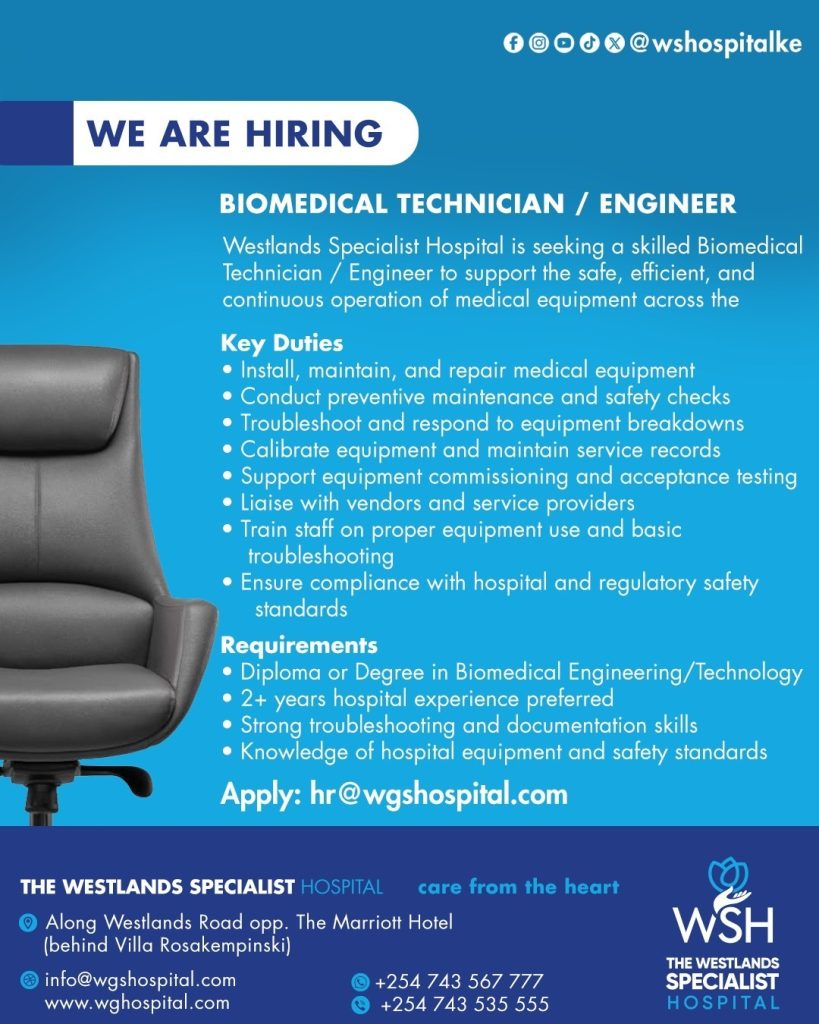 Westlands Specialist Hospital is seeking a skilled Biomedical Technician / Engineer to support the safe, efficient, and continuous operation of medical equipment across the hospital.