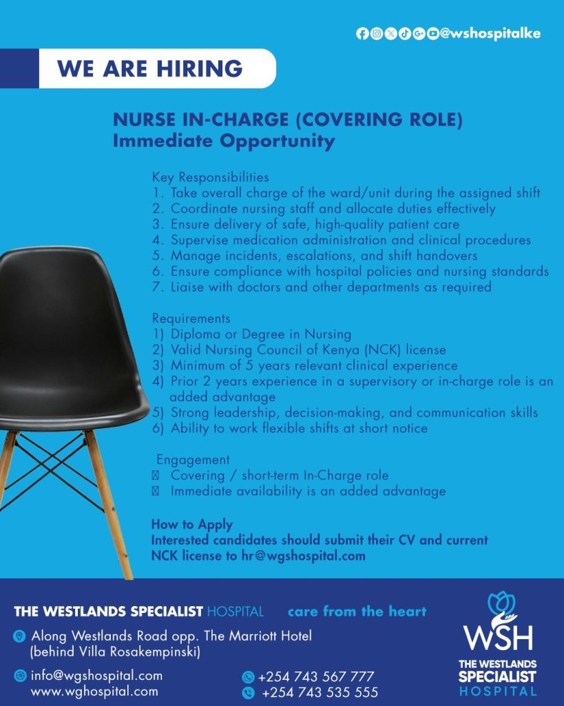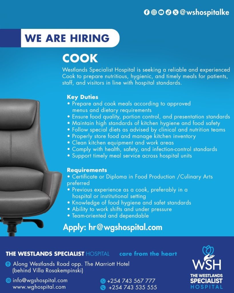 Westlands Specialist Hospital is seeking a reliable and experienced Cook to prepare nutritious, hygienic, and timely meals for patients, staff, and visitors in line with hospital standards.
